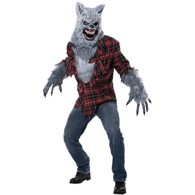 El rugido del lobo monstruo. El disfraz de licántropo gris incluye máscara, camisa a cuadros con pecho y brazos de piel sintética, y guantes con ribete de piel sintética.